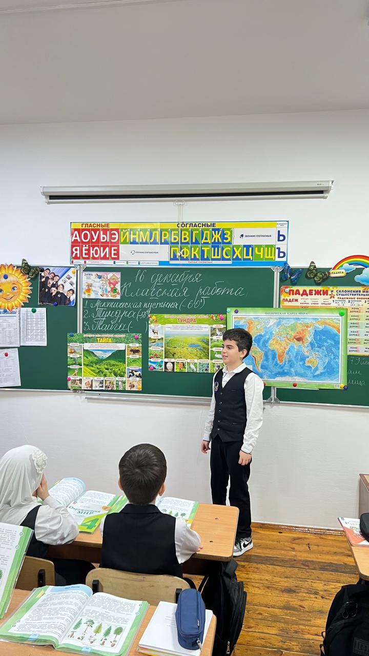 16 декабря учитель 4 Б класса Дабачхаджиева Лаура Рамзановна провела урок окружающего мира по теме «Тайга». Урок был хорошо подготовлен. Все обучающиеся активно работали. Учитель использовал различные формы и методы проведения урока для глубокого усвоения материала.